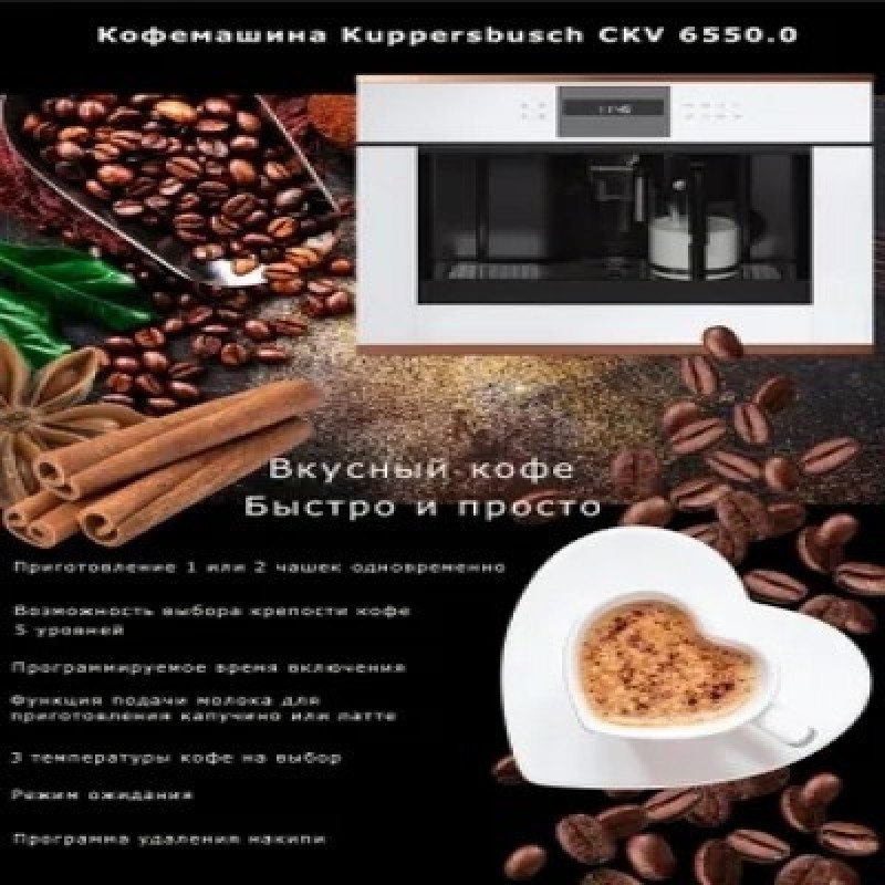 Встраиваемая кофемашина Kuppersbusch CKV 6550.0ЖК-дисплей с текстовым и графическим полями Электронная система управления с сенсорными кнопками Программируемое количество кофе для 5 размеров чашек (эспрессо, малая, средняя, большая, высокая) Приготовление 1 или 2 чашек Функция подачи молока для приготовления капучино или латте Съемный контейнер для молока с функцией очистки Возможность использования кофейных зерен или молотого кофе Регулируемый по высоте раздатчик кофе Давление при заваривании ? 15 бар 3 температуры кофе на выбор Возможность выбора крепости кофе (5 предварительно заданных уровней) Отдельные нагреватели для заваривания кофе и приготовления горячей воды Программа удаления накипи Автоматическое ополаскивание при включении и отключении Емкость для воды заполняется спереди Электронный таймер с белыми индикаторами Программируемое время включения Режим ожидания Телескопические направляющие для легкого заполнения кофемашиныПодсветка чашек:Наблюдение доставляет удовольствие - хорошо известный факт. Светодиодная подсветка преподносит только что сваренный кофе в правильном свете. И приготовление кофе становится хорошей традициейЕмкость для свежей воды:Духовые шкафы и кофемашины Kuppersbusch легко встраиваются в любую кухонную мебель, так как благодаря наличию емкости для свежей воды подсоединение к водопроводу не требуютсяХарактеристики:Потребляемая мощность: 1,35 кВт (вилка Schuko)Размеры прибора (Ш x В x Г): 595 x 455 x 475 мм (вкл. фасад 20 мм и телескопические направляющие) Размеры ниши (Ш x В x Г): 560 x 450 x 550 мм"